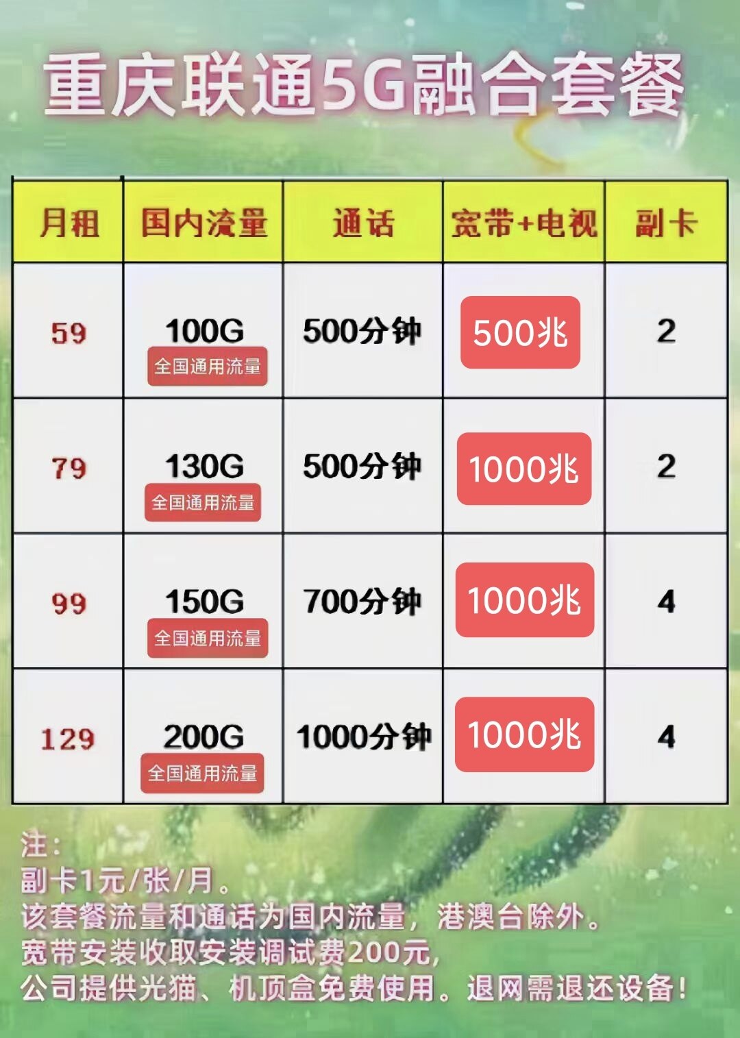 前面才装联通59月租,100g通用十500分钟,就是要另外办两张副卡,不办副卡的话70g十500