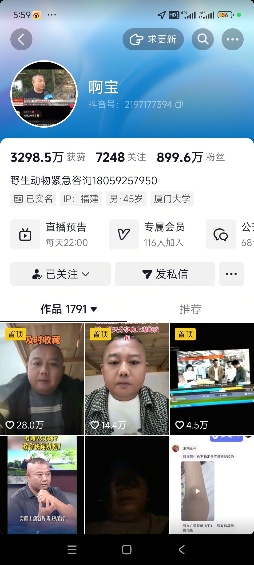 抖音上有个专门养蛇,她看了就晓得咋治疗,叫五步小娘子