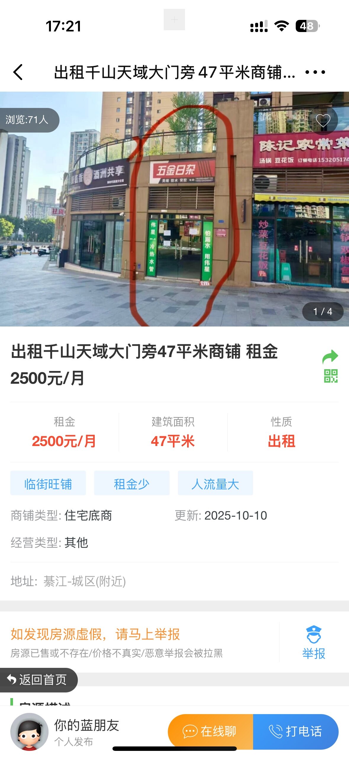 千山天域大门旁旺铺出租 47平方 ,可以外摆,户型周正,无转让费,2500元/月