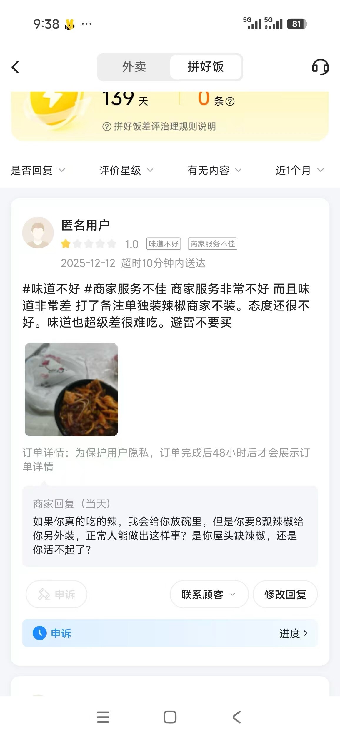 是这样的,我之前点外卖说要多辣,商家一般在上面会给我加很多很多辣椒,他这种纯粹就是无理。