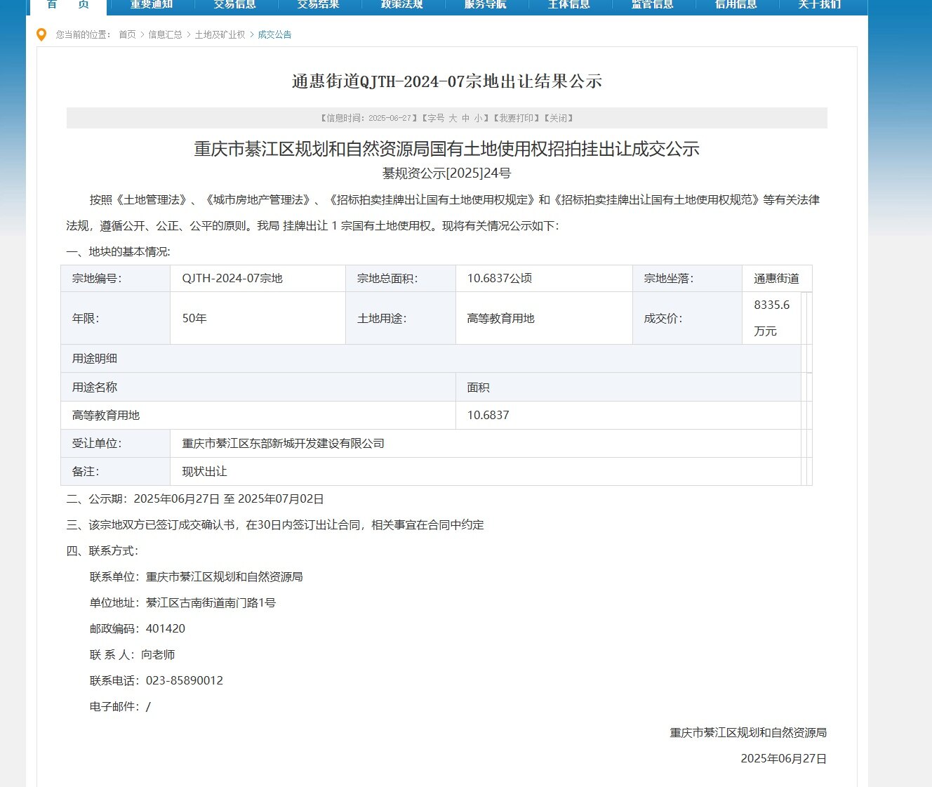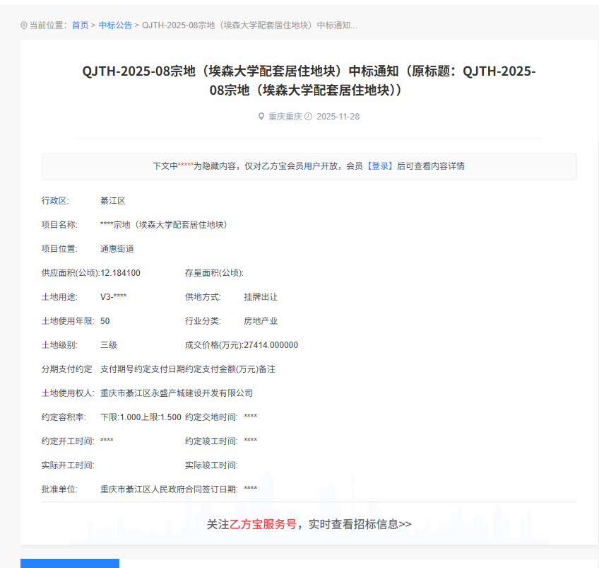 没有搞懂,是2021年綦江区引进的高校,重庆德国埃森大学地块已经出让?还是“2021綦江区引进重庆德国埃森大学建设用地,綦江区于2025年6月27日正式确认出让。”初看还以为埃森大学所需地块不要了,出让返还给綦江区。