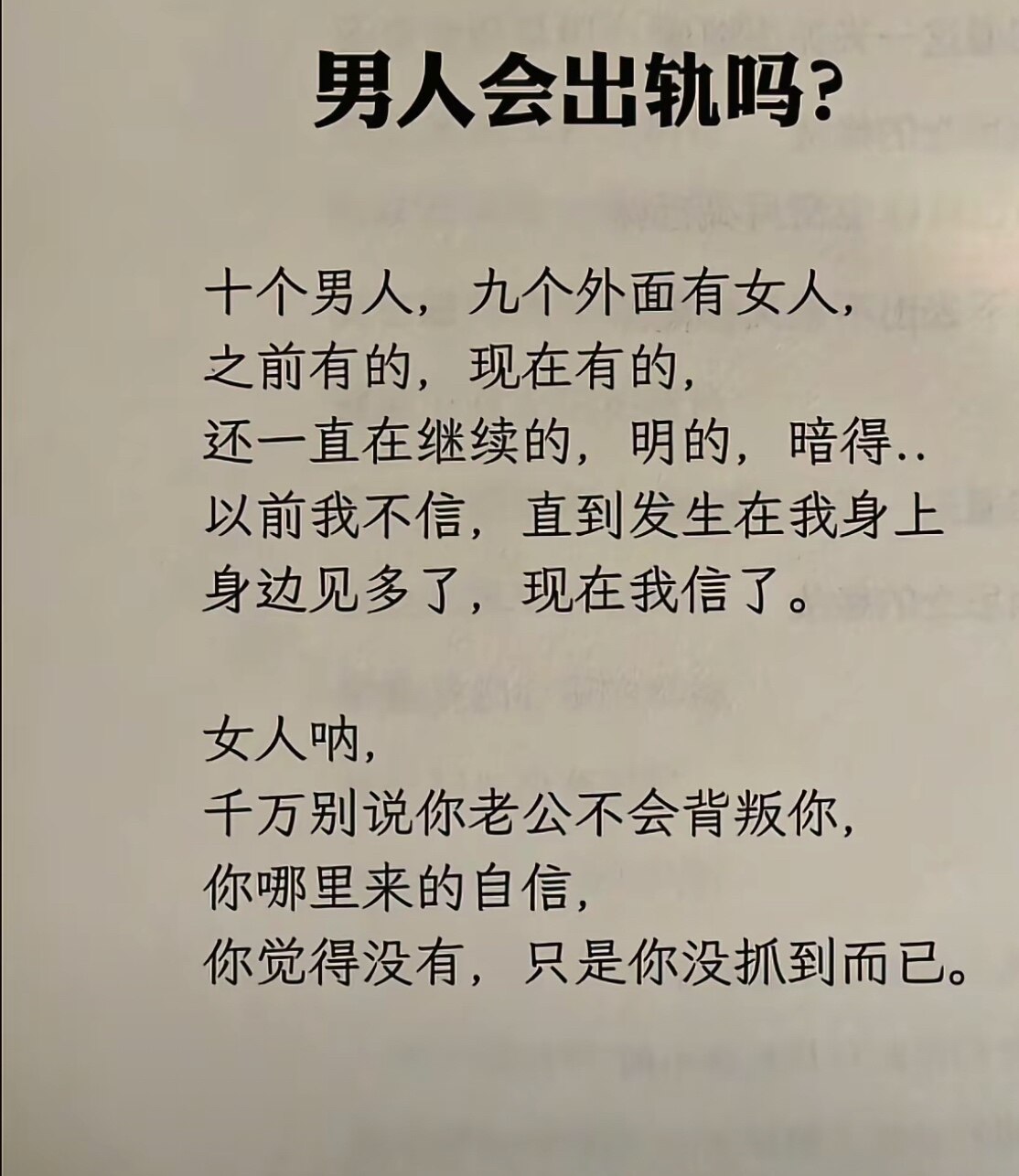 男人出轨还不是女人造成的,女人不给机会,男人想出也出不了