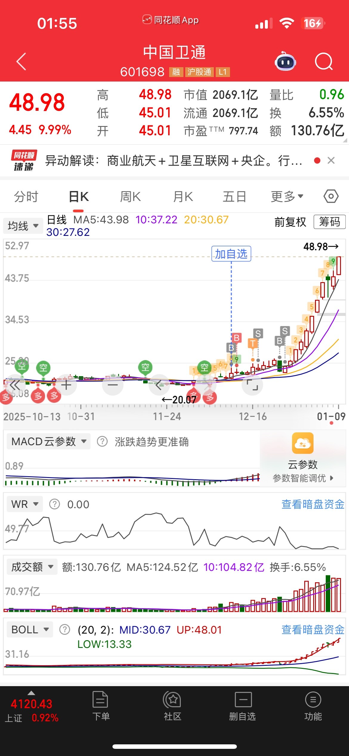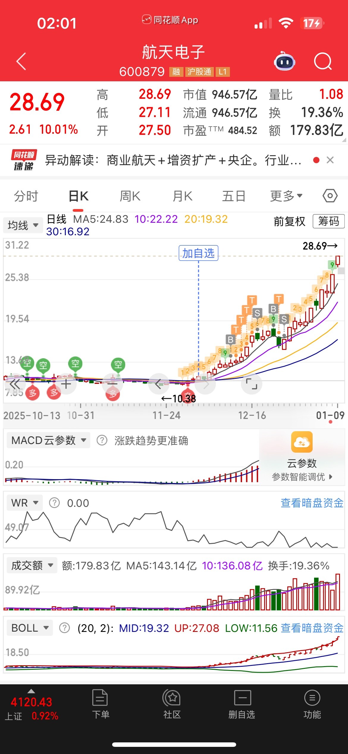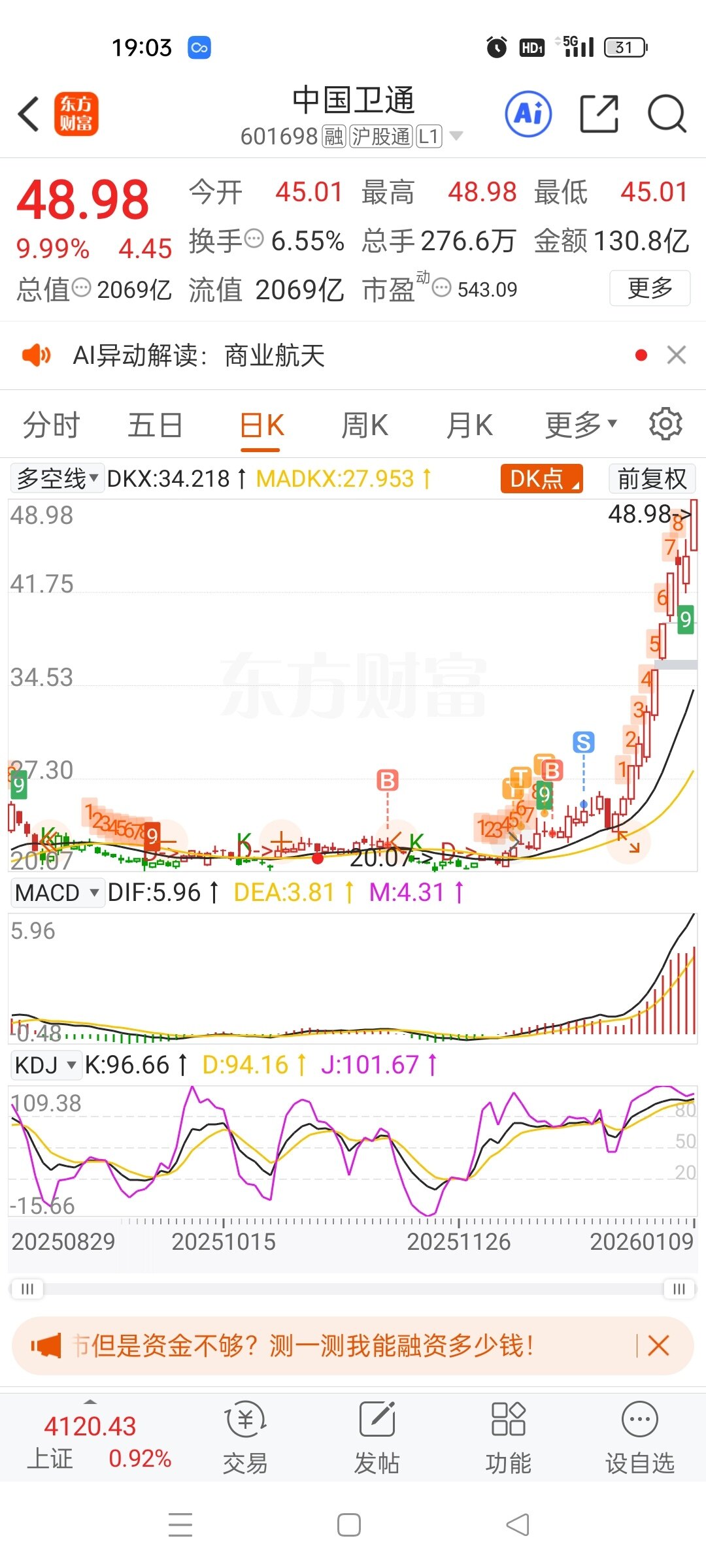 商业航天资金介入太深.一时半会死不了.只会高低切绕异动.就算回调.还有一个终极预期.那就是火箭回收成功!但是一旦回收成功!那就是主力借利好出货的时候了.