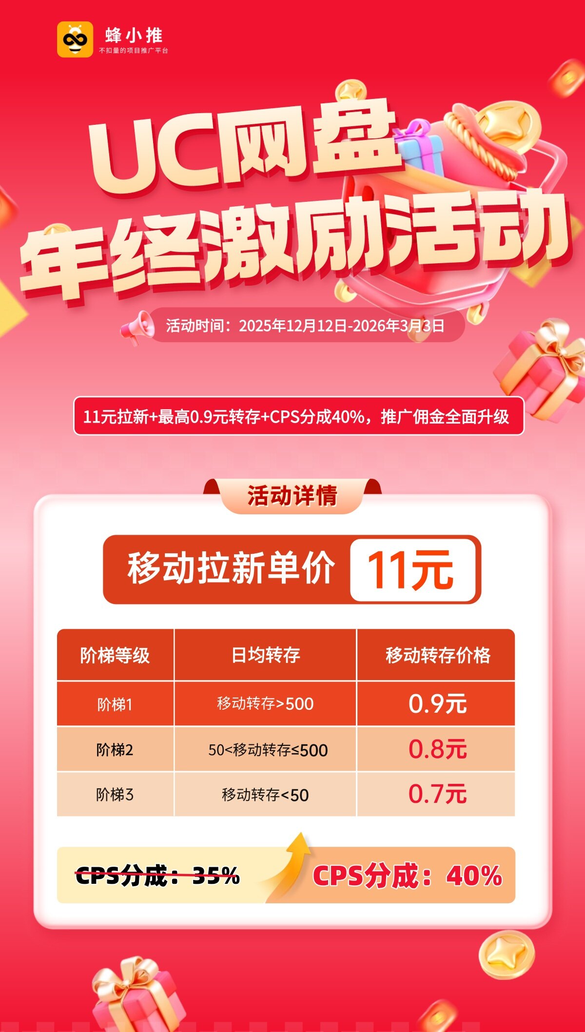 关键要避开一个误区,不是随便找些资料就能实现自动变现。只有那些用户主动找、需求刚性、稀缺性强的优质资源,才能形成持续的吸引力。把这类资源和UC网盘的拉新链路——【蜂小推】绑定,通过【蜂小推】获取权限后,用户为了获取资源主动注册转存,整个过程自然且顺畅,完全不用你刻意推销。且现在通过【蜂小推】还可以参加年终激励活动,现在年终期间佣金大幅提升: