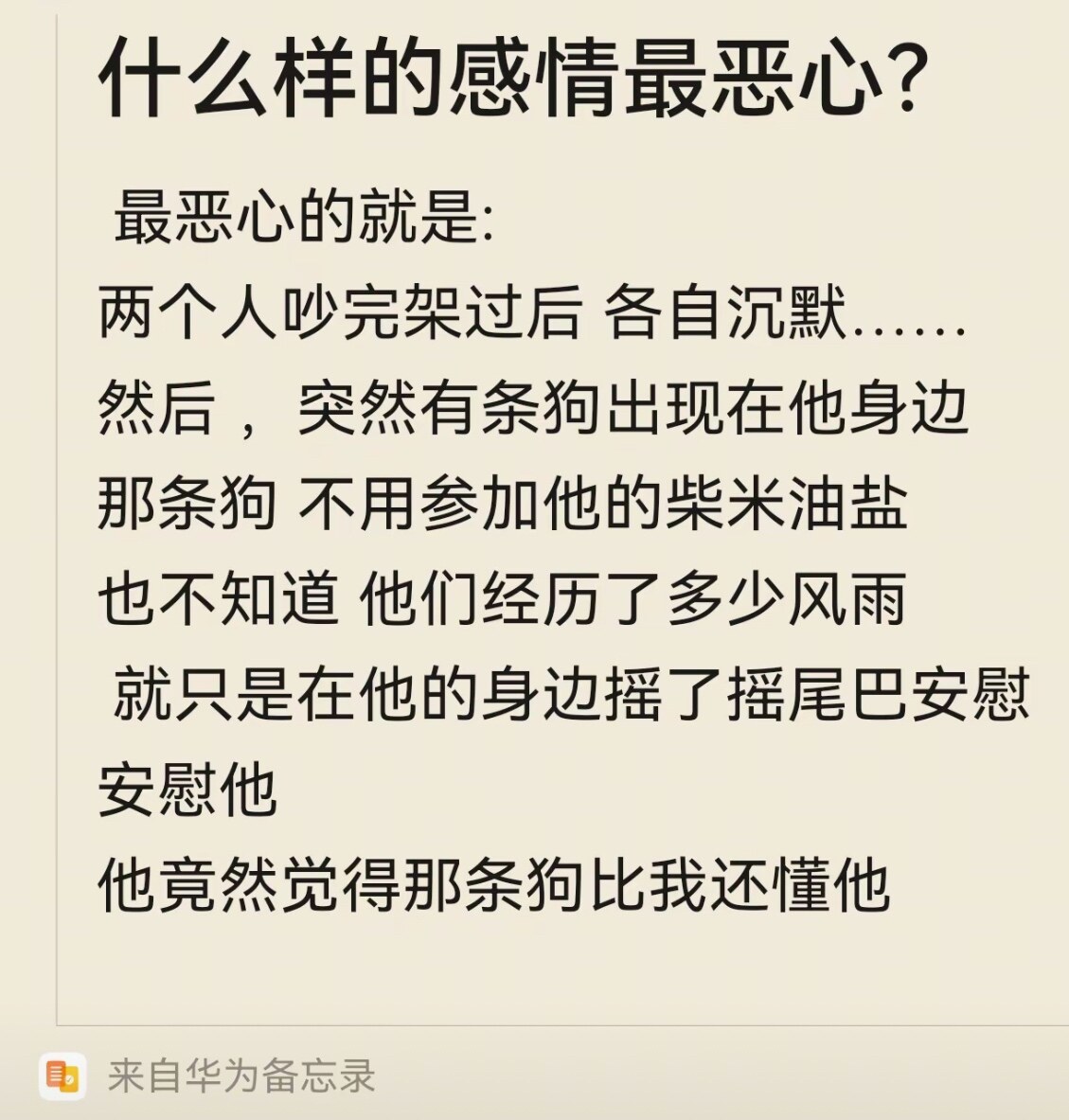 两个人吵完架后,各自沉默……然后,突然有条狗出现在他身边,那条狗不用参加他的柴米油盐,就只是在他身边摇了摇尾巴安慰安慰他,他竟然觉得那条狗很懂他