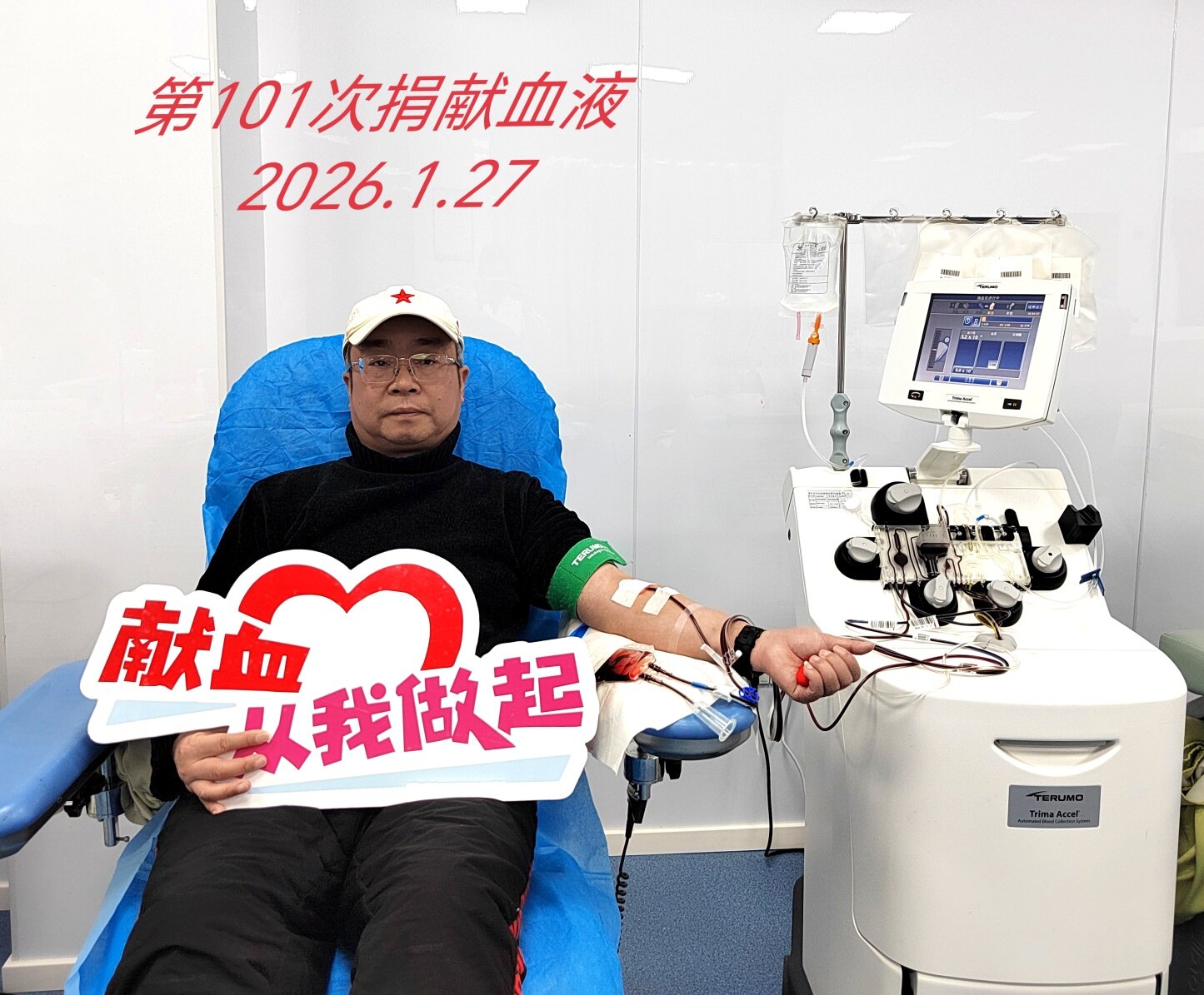 2026年1月27日是今年第2次捐献血小板,捐献两个治疗量400cc,今年献血800cc。截止今天,献血总计101次,其中:献全血15次,献血小板86次。献血总量39200cc(荣誉表彰献血次数196次)。捐献血液,分享生命!为保障临床急需救治的患者有救命血可用,呼吁广大爱心人士加入到无偿献血队伍中来,捐献可以再生的血液,挽救不可重来的生命,奉献您的赤诚热血!
