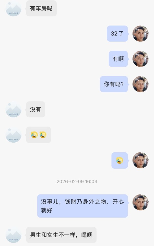 谈啥子?谈钱嘛? 前几天一个在线的女的征婚加我,上来第一句有车吗有房吗? 我说全款房两套,全款车几十个,我问她有没有她说她没有。我说你自己都没有你问这些做啥子?大家都是人。恋爱不是你喜欢我我想跟你在一起吗?现在有几个女的是正儿八经谈恋爱的,无非都是打着恋爱的旗号,骗吃骗喝等着一嘴吃下别人几辈人的累积财富。这种恋爱不谈也罢