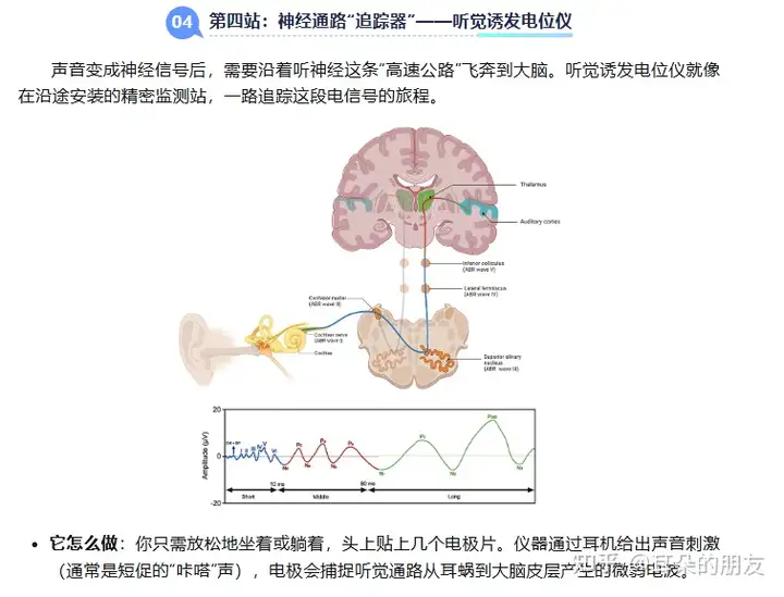 最常用的一种——听性脑干反应(ABR):它主要记录声音刺激后10毫秒内,从听神经到脑干的电反应。即使你在睡眠或麻醉状态下也能进行,是诊断婴幼儿听力损失、判断听力损失性质(如是否是听神经病)和损伤部位的关键客观检查。