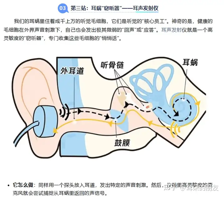它在听什么:如果能记录到正常的耳声发射,通常说明耳蜗外毛细胞功能良好;如果引不出,则提示耳蜗可能受损。这是新生儿听力筛查和早期发现耳蜗性病变的核心技术。
