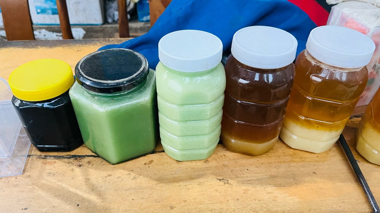 这张照片大致上分为三种颜色,黑色的是米团花黑蜜也被称为机油蜜,绿色的是五倍子蜜,和米团花黑蜜一样,都是西双版纳的地域特色蜂蜜。其他颜色的蜜,就是百花蜜。