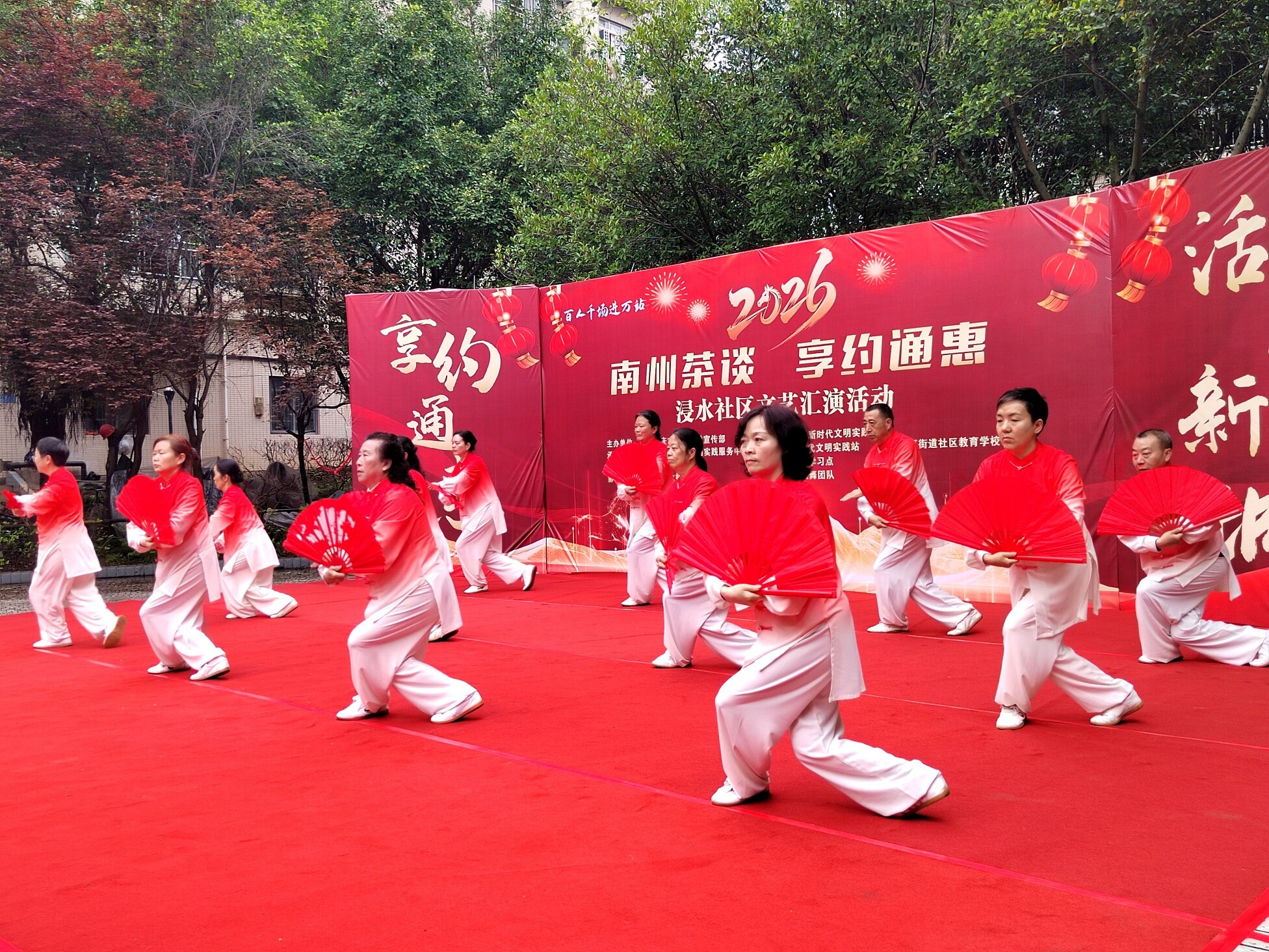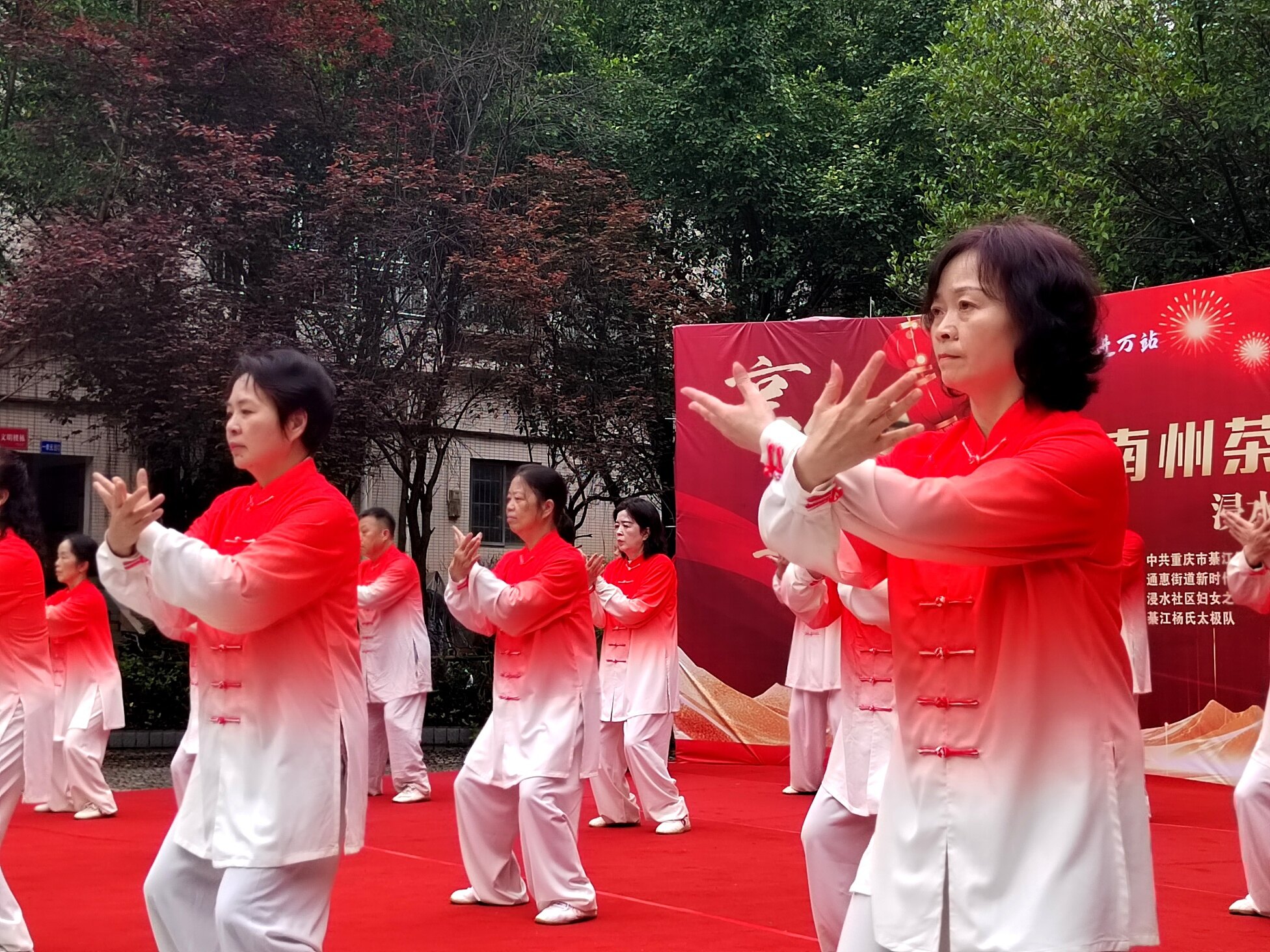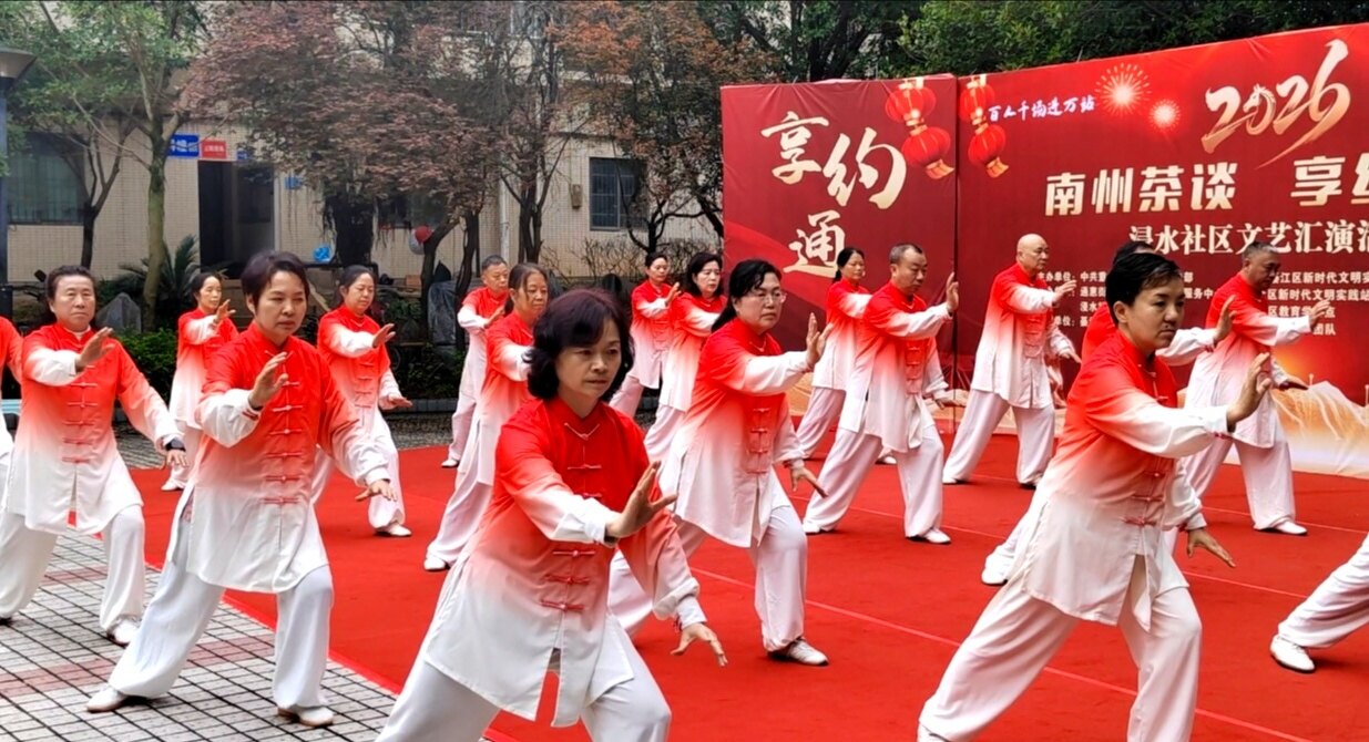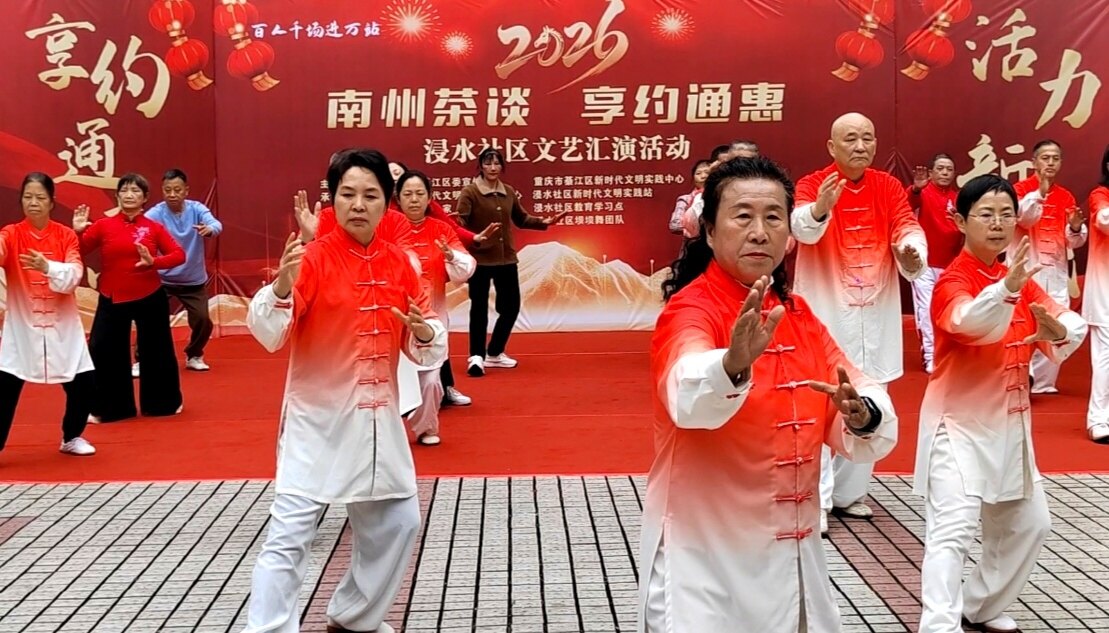 文艺表演环节精彩纷呈,居民们轮番上阵,尽显多才多艺!綦江杨氏太极队带来太极功夫扇表演,招式舒缓有力、行云流水,尽显太极的刚柔并济;随后又呈现新编杨氏太极26式,动作流畅规范,展现出传统文化的独特魅力 。独舞《我的中国心》深情动人,舞姿里满是爱国情怀;手花舞《亚洲雄风》活力四射,点燃全场热情,每一个节目都赢得阵阵掌声,充分展现浸水社区居民的精神风貌 。