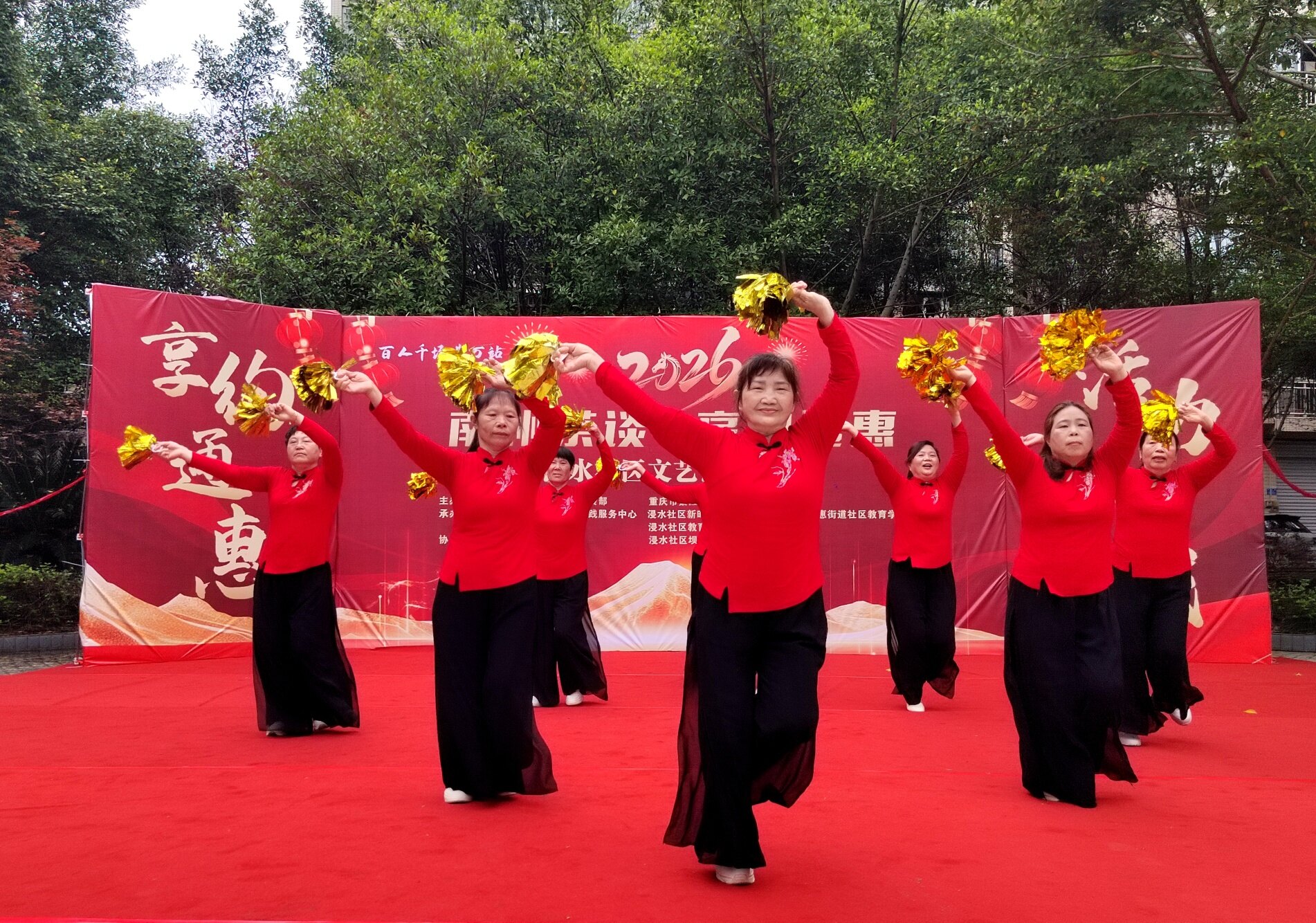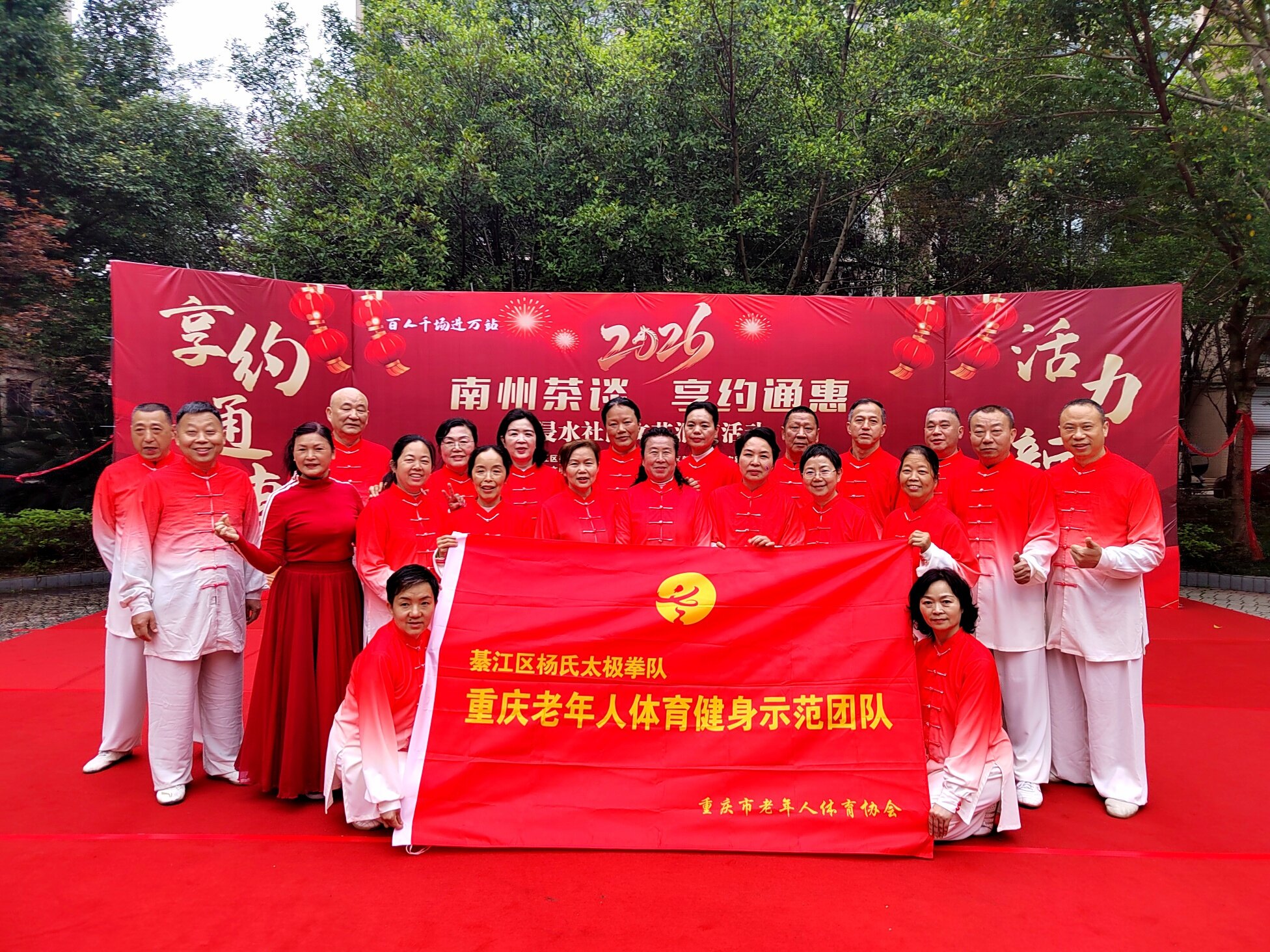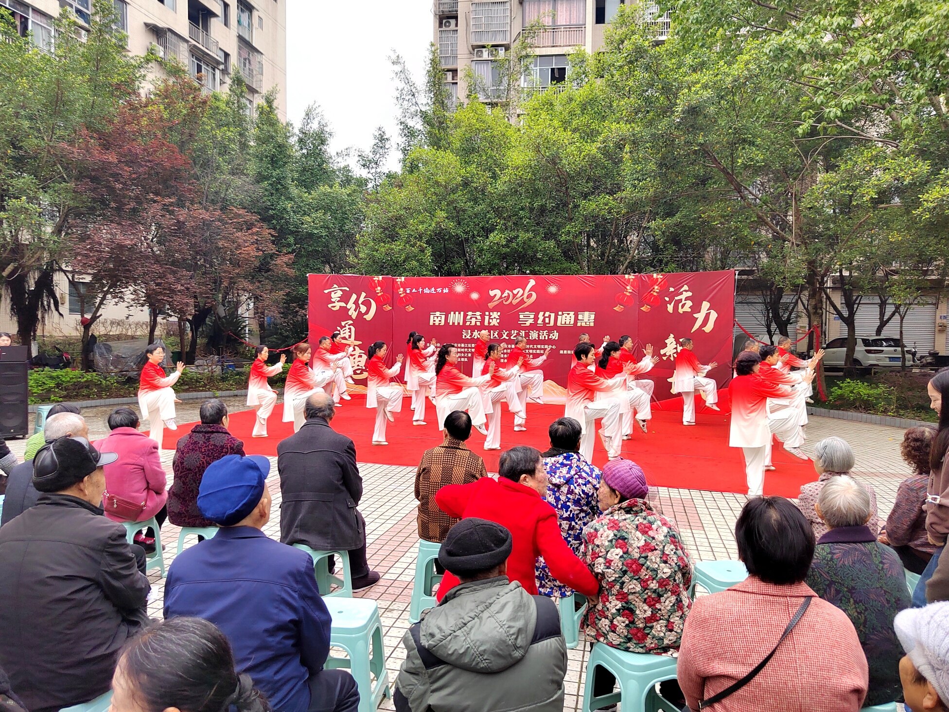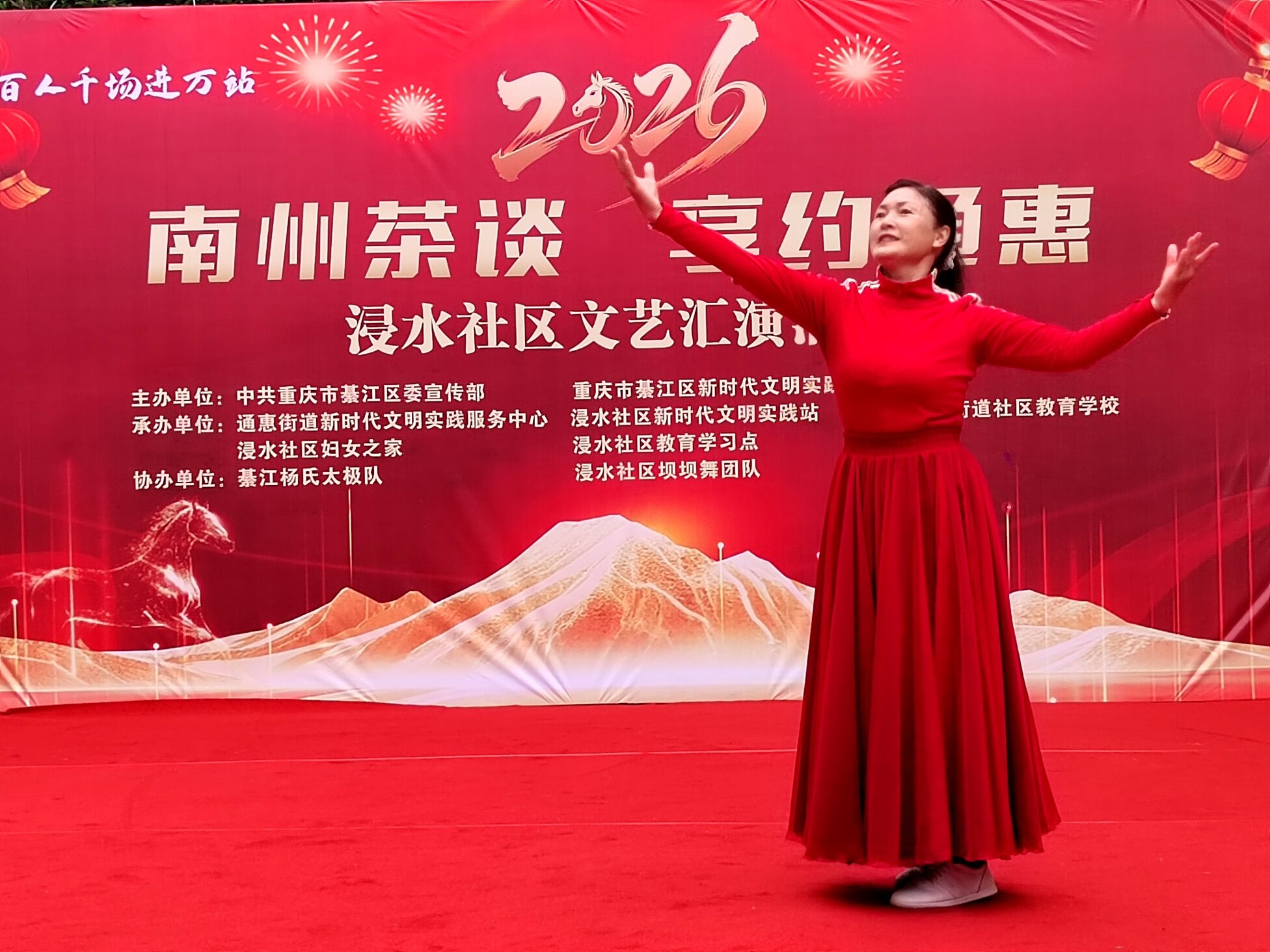 文艺表演环节精彩纷呈,居民们轮番上阵,尽显多才多艺!綦江杨氏太极队带来太极功夫扇表演,招式舒缓有力、行云流水,尽显太极的刚柔并济;随后又呈现新编杨氏太极26式,动作流畅规范,展现出传统文化的独特魅力 。独舞《我的中国心》深情动人,舞姿里满是爱国情怀;手花舞《亚洲雄风》活力四射,点燃全场热情,每一个节目都赢得阵阵掌声,充分展现浸水社区居民的精神风貌 。