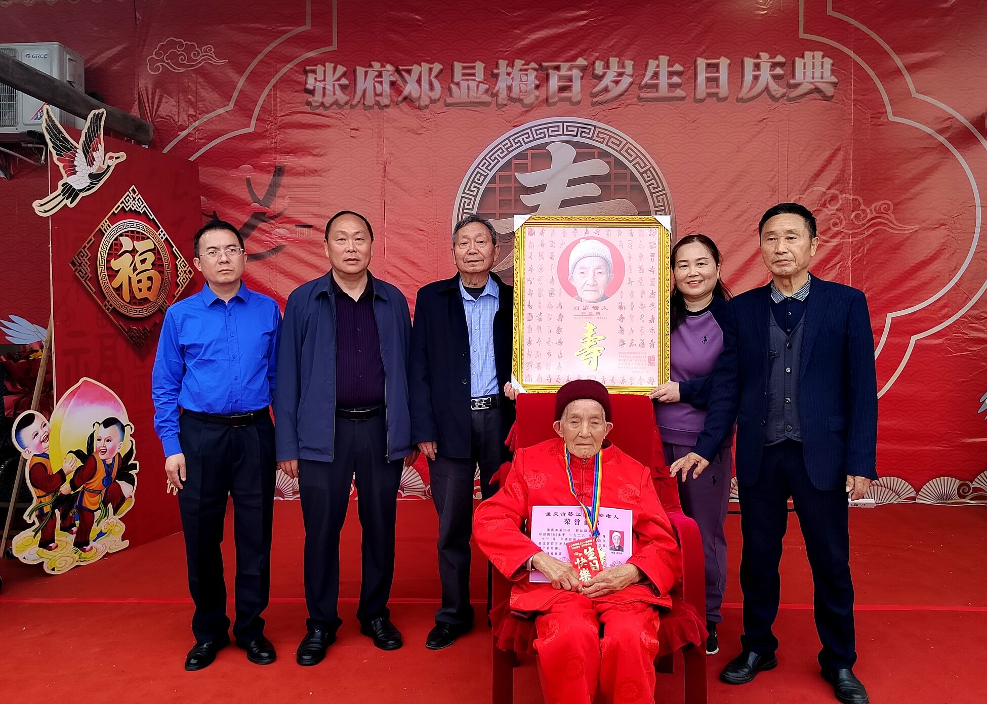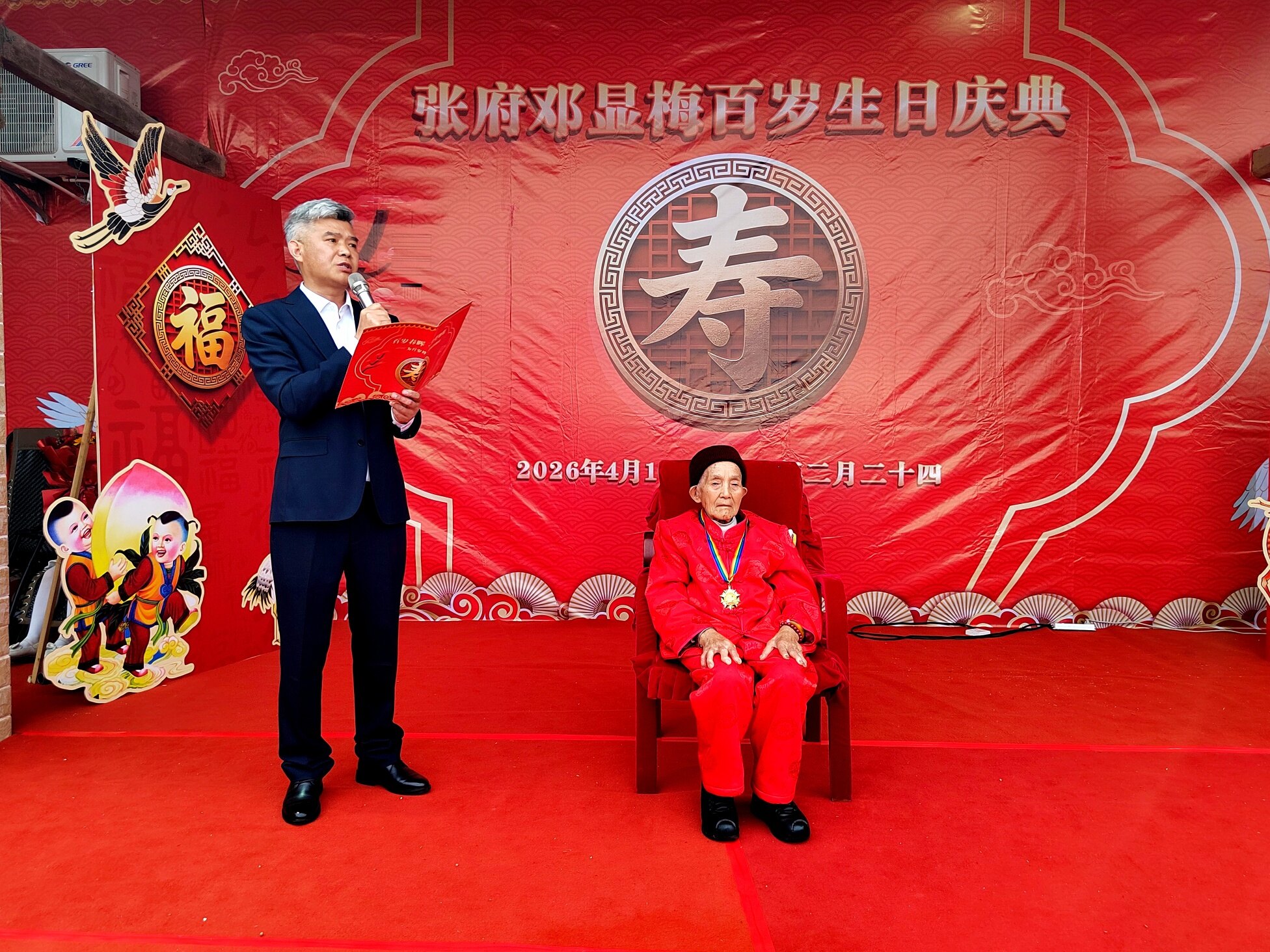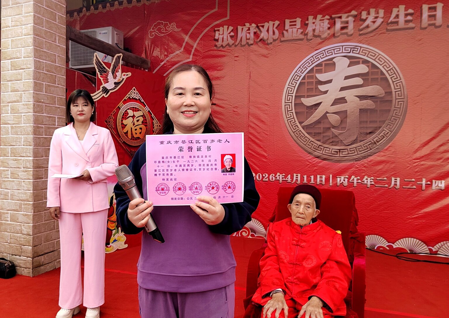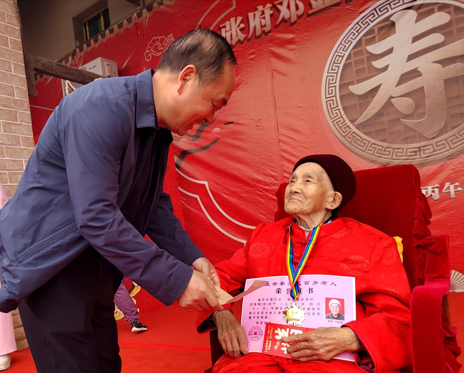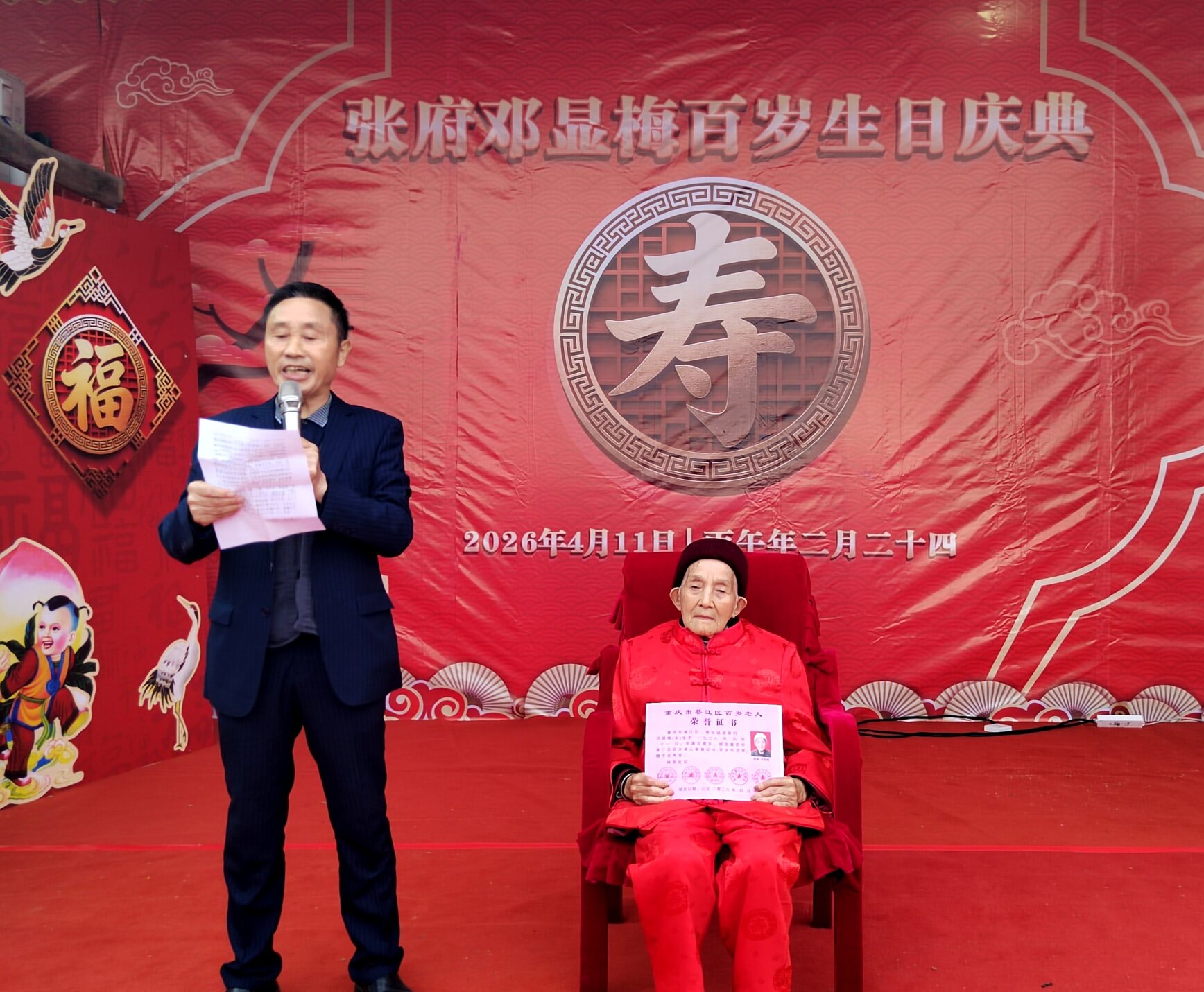 庆典上,老领导姜主任登台致辞,深情回顾了邓显梅老人一生勤劳善良、宽厚待人的美好品行,对老人百岁高寿表示热烈祝贺,也对张府和睦美满的家风给予高度赞扬。紧接着,綦江区老龄委、郭扶镇相关领导依次上台,为邓显梅老人送上百岁寿辰证书与荣誉奖章,肯定老人福寿安康的美满人生,传递党和政府对老年群体的关怀与关爱。郭扶镇老年协会也特意为老人赠送镌刻着美好祝愿的百岁匾,协会负责人现场致辞,祝福老人福寿绵长、笑口常开。