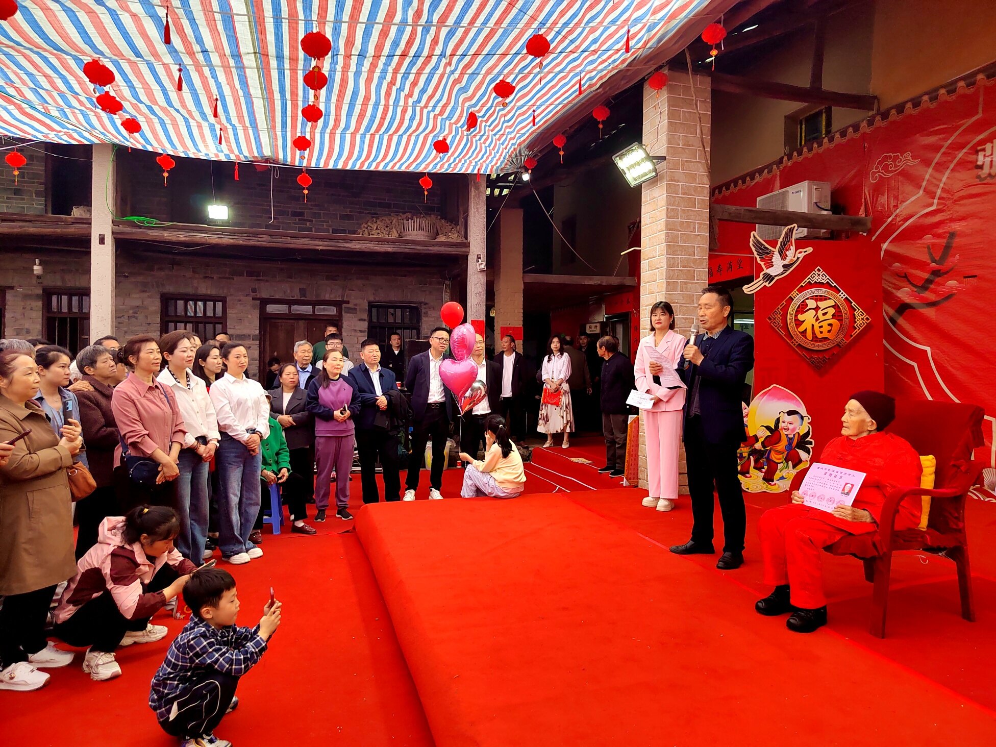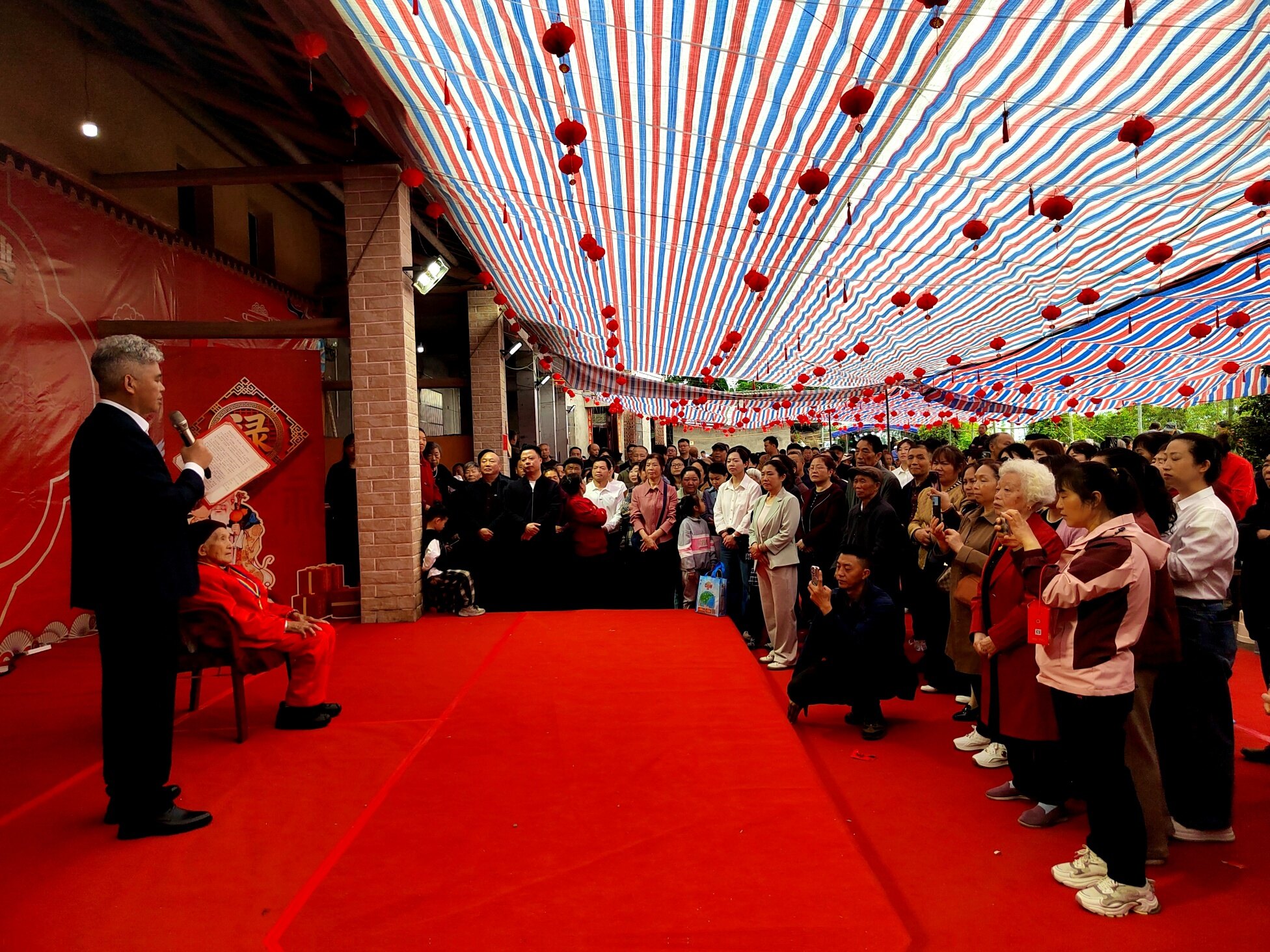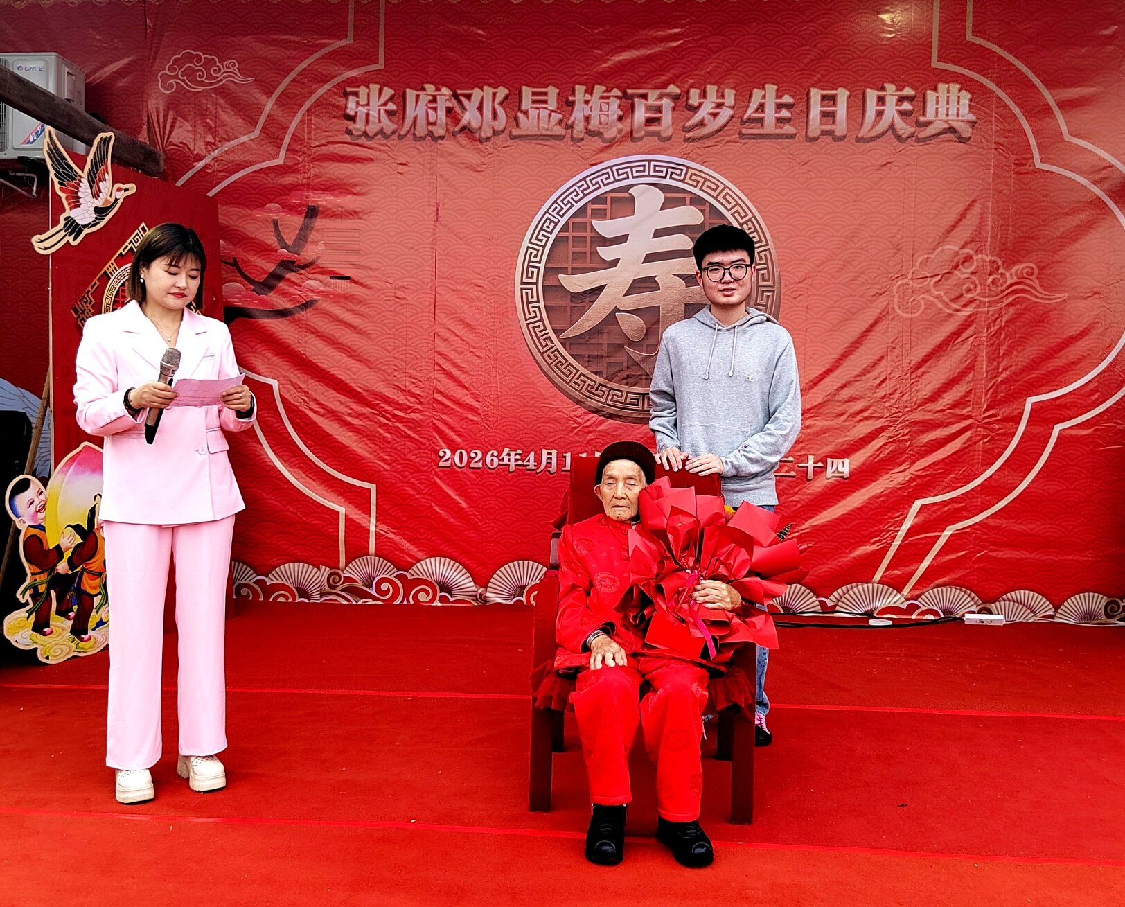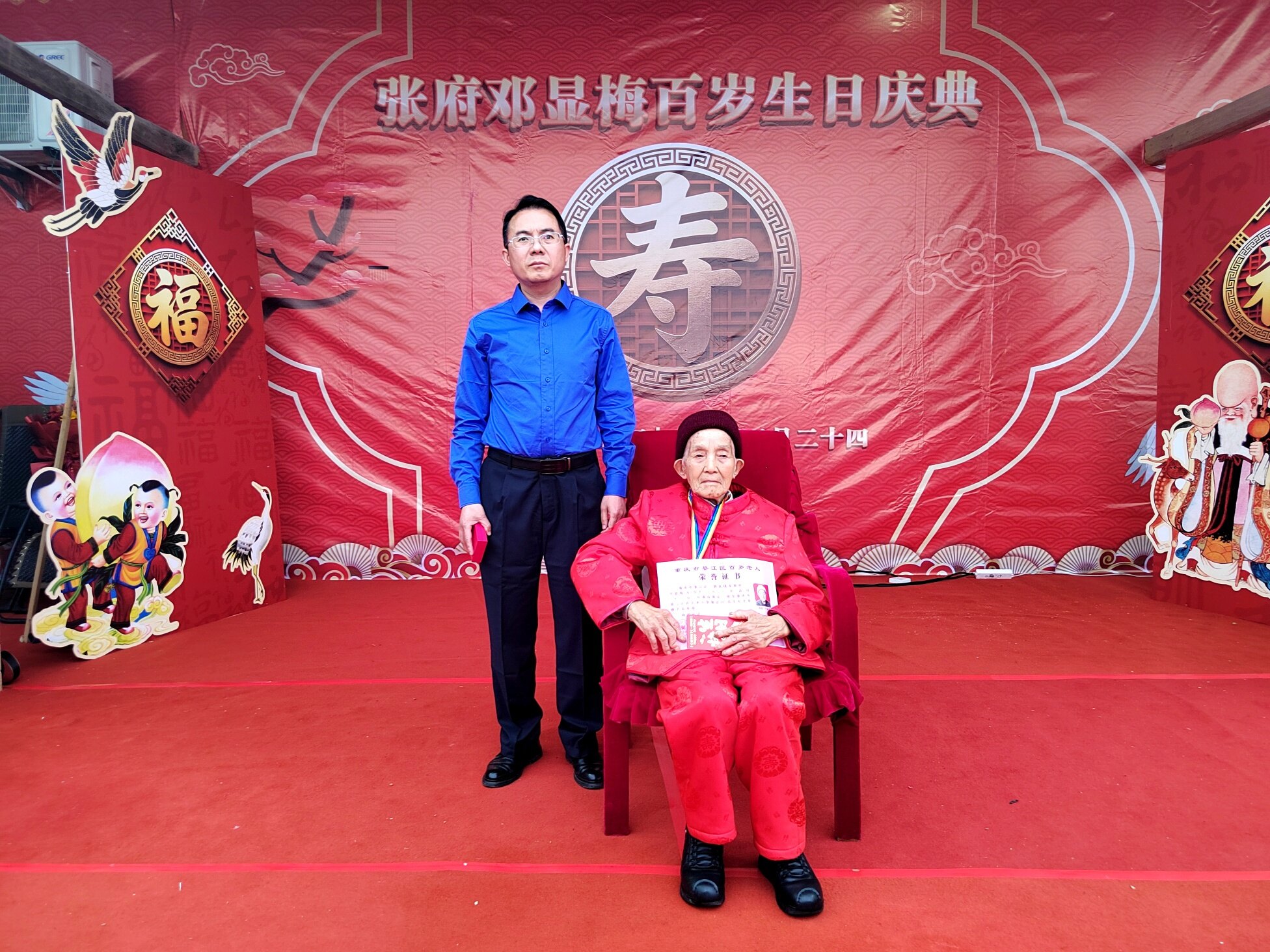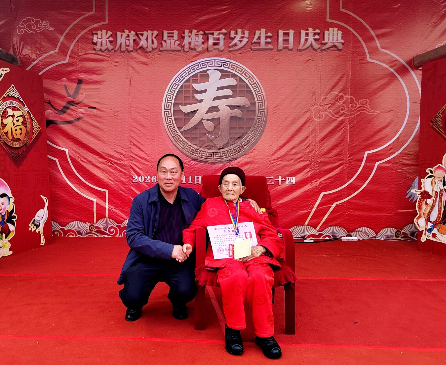 庆典上,老领导姜主任登台致辞,深情回顾了邓显梅老人一生勤劳善良、宽厚待人的美好品行,对老人百岁高寿表示热烈祝贺,也对张府和睦美满的家风给予高度赞扬。紧接着,綦江区老龄委、郭扶镇相关领导依次上台,为邓显梅老人送上百岁寿辰证书与荣誉奖章,肯定老人福寿安康的美满人生,传递党和政府对老年群体的关怀与关爱。郭扶镇老年协会也特意为老人赠送镌刻着美好祝愿的百岁匾,协会负责人现场致辞,祝福老人福寿绵长、笑口常开。
