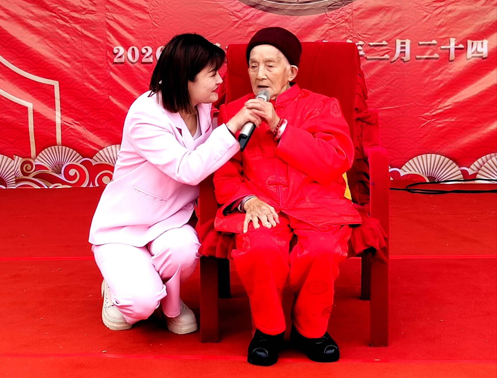 上午时分,气势恢宏、韵味十足的永城吹打奏响,正式拉开了本次百岁寿宴庆典的帷幕。在众人的热切期盼中,身着喜庆红色服饰的邓显梅老人,在子女们的细心搀扶下缓缓登场,精神矍铄、面容慈祥,现场顿时响起阵阵热烈的掌声与欢呼声,满是对老人的敬重与祝福。随后,老人的孙辈们手捧鲜花,满怀深情地走上台前,将鲜花献给百岁长辈,用最质朴的方式表达对老人的敬爱与感恩,温情画面令人动容。