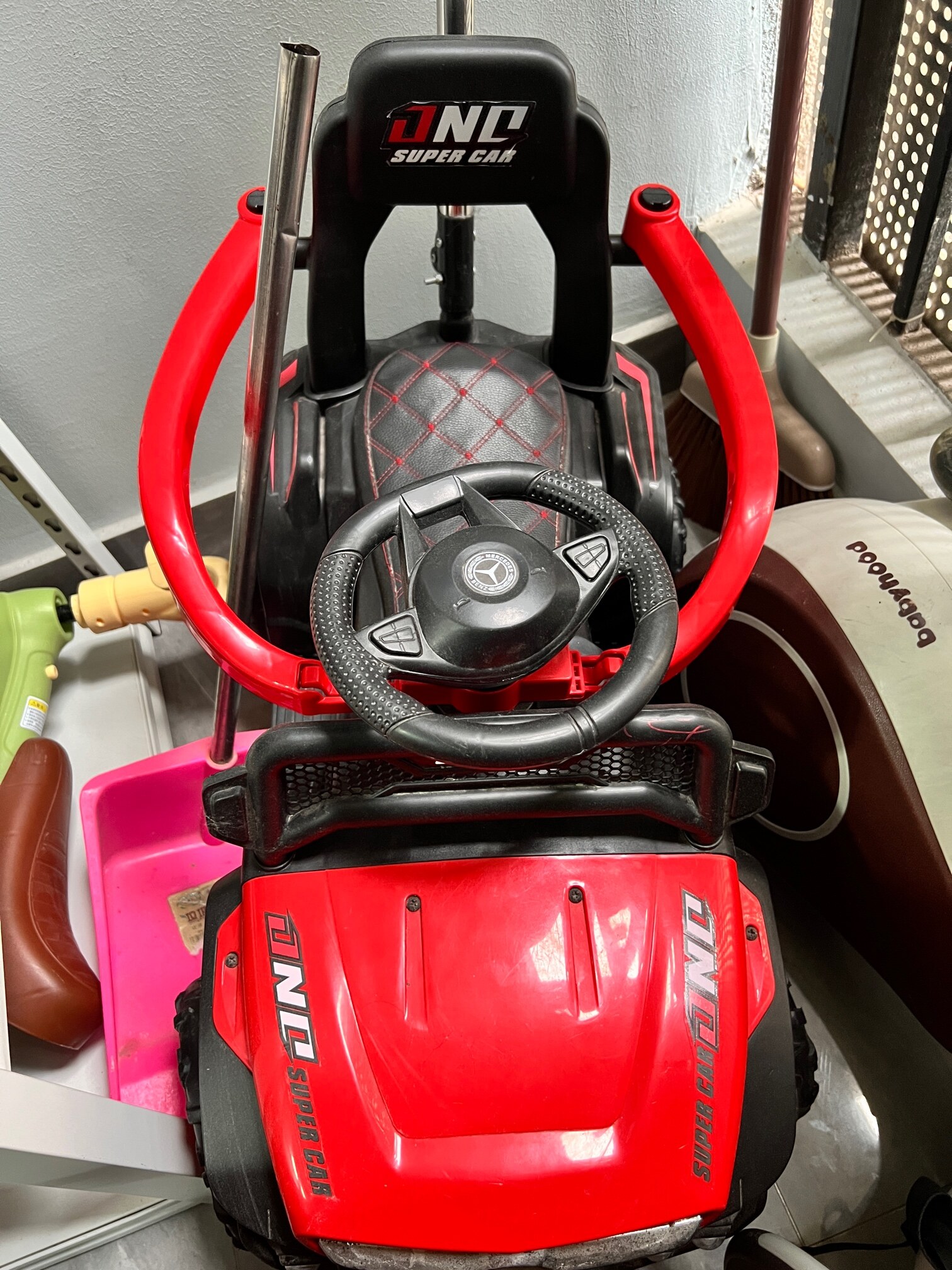 玩具电动车,有充电线,可踩油门和推行,适合 8 个月-2 岁宝宝使用,护栏可拆卸