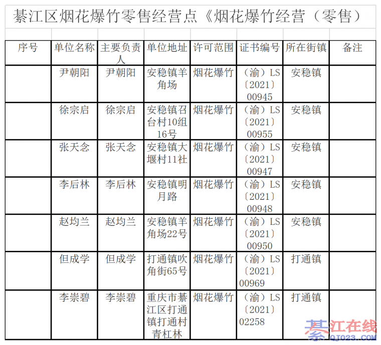 重庆市綦江区应急管理局 关于注销146家烟花爆竹经营(零售)许可证的通告 一、我区目前共145家烟花爆竹零售经营点许可证于2021年3月1日到期,根据《烟花爆竹安全管理条例》、《烟花爆竹经营许可实施办法》等有关 ...