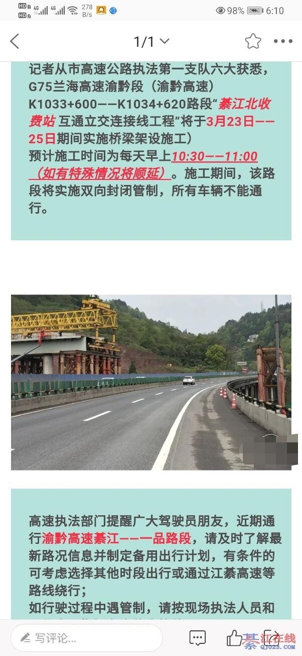 綦江到重庆高速将实行双向封闭,各位司机朋友们可以错开时间及避开该道路出行。
