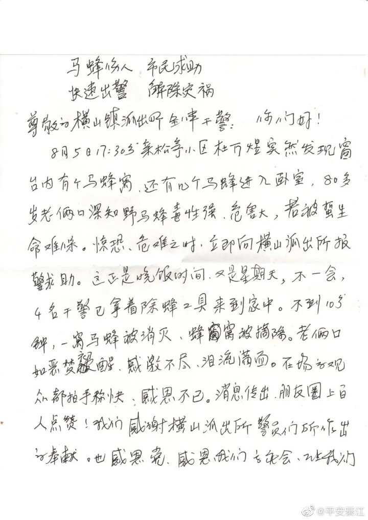 【一封感谢信 浓浓警民情】 9月10日,綦江区公安局横山派出所收到一封感谢信,字里行间包含了群众对公安工作的认可。9月5日18时许,横山派出所接到群众报警:家里的窗户上有个很大的马蜂窝,好几只马蜂还飞进了屋里 ...