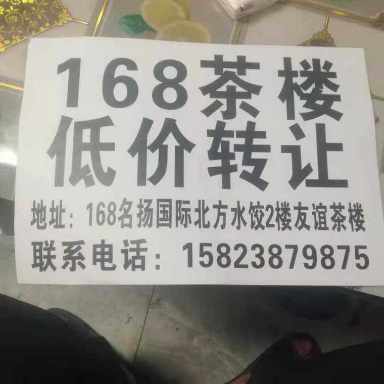 168名扬广场旁边北方水饺2楼友谊茶楼诚心低价转让,有意者请电话联系:15823879875
