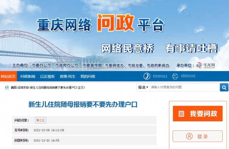 问政回音:新生儿住院随母报销要先办理户口吗? 綦江区医保局:新生儿自出生当日至当年12月31日可随参加我市城乡居民医疗保险的法定监护人按规定享受居民医保待遇(未上户口也可以),出生当年发生的医 ...