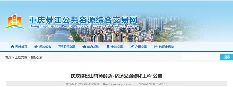 扶欢镇松山村黄颠嘴-猪场公路硬化工程竞争性比选公告 一、 竞争性比选条件本竞争性比选项目扶欢镇松山村黄颠嘴-猪场公路硬化工程已由 重庆市綦江区发展和改革委员会以綦发改审批﹝2021﹞406号文件批准建设, ...