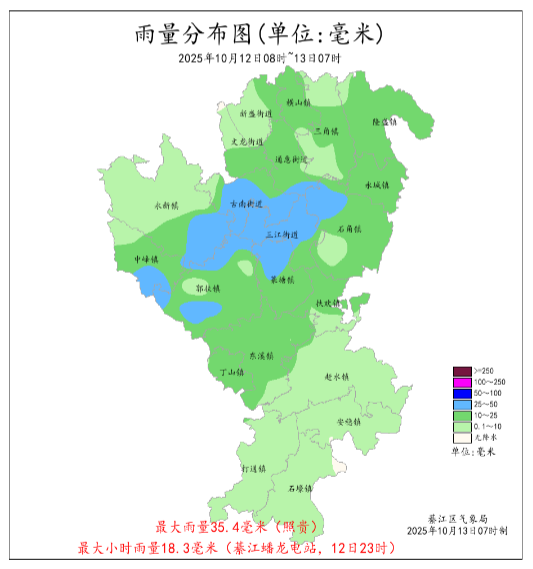 2025年10月12日08:00-10月13日07:00,全区降水以小到中雨为主,局地大雨。大雨8站,中雨32站,小雨30站;其中最大降雨量为三江照贵35.4毫米,最大小时雨强为16.0毫米(中峰,12日23时),其余地区雨量在0.1~32.9毫米之 ...