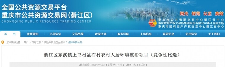近日,重庆市公共资源交易网发布《綦江区东溪镇上书村盆石村农村人居环境整治项目竞争性比选公告》其中提到了项目建设,一起来看。 綦江区东溪镇上书村盆石村农村人居环境整治项目竞争性比选公告 (公告截图) ...