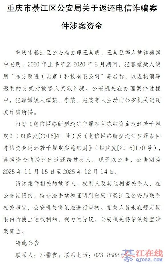 重庆市綦江区公安局关于返还电信诈骗案件涉案资金 来源:平安綦江