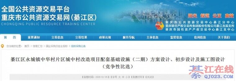 近日,重庆市公共资源交易网发布《綦江区永城镇中华村片区城中村改造项目配套基础设施(二期)方案设计、初步设计及施工图设计(项目名称)竞争性比选公告》其中提到了项目建设,一起来看。 綦江区永城镇中华村片区 ...