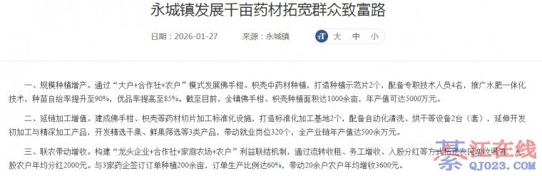永城镇发展千亩药材拓宽群众致富路 一、规模种植增产。通过“大户+合作社+农户”模式发展佛手柑、枳壳中药材种植,打造种植示范片2个,配备专职技术人员4名,推广水肥一体化技术,种苗自给率提升至90%,优品率提 ...