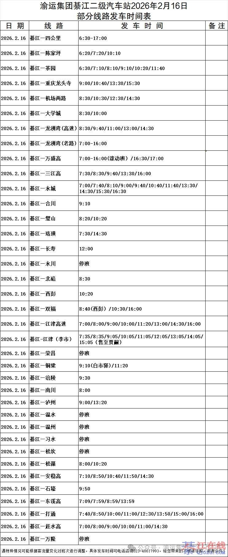 广大市民朋友:现将綦江二级车站春节期间(2026年2月16日、2月17日)班车临时发车时刻表整理公布如下,请大家相互转告。 △点击图片查看大图 二级车站咨询台电话:48617993 温馨提示 綦江汽车 ...