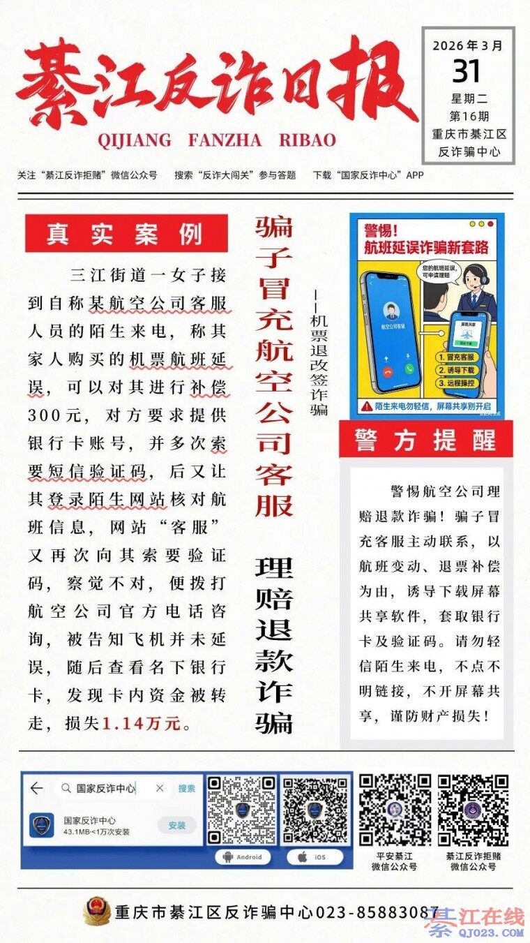 綦江区全民反诈每日案例(2026年3月31日)骗子冒充航空公司客服理赔退款,索要短信验证码,别信! 来源:綦江反诈拒赌