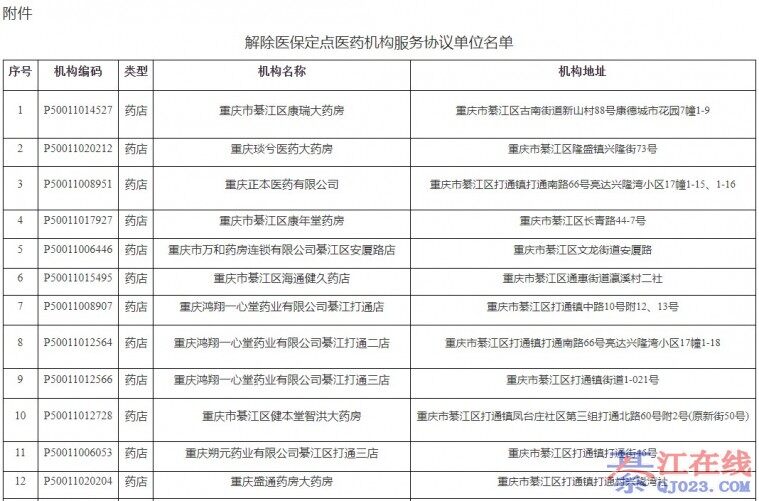 重庆市綦江区医疗保障事务中心关于解除医保服务协议医药机构名单的公告 根据《医疗机构医疗保障定点管理暂行办法》(国 家医疗保障局令第2号)《零售药店医疗保障定点管理暂行办法》(国 家医疗保障局令第3号)《 ...