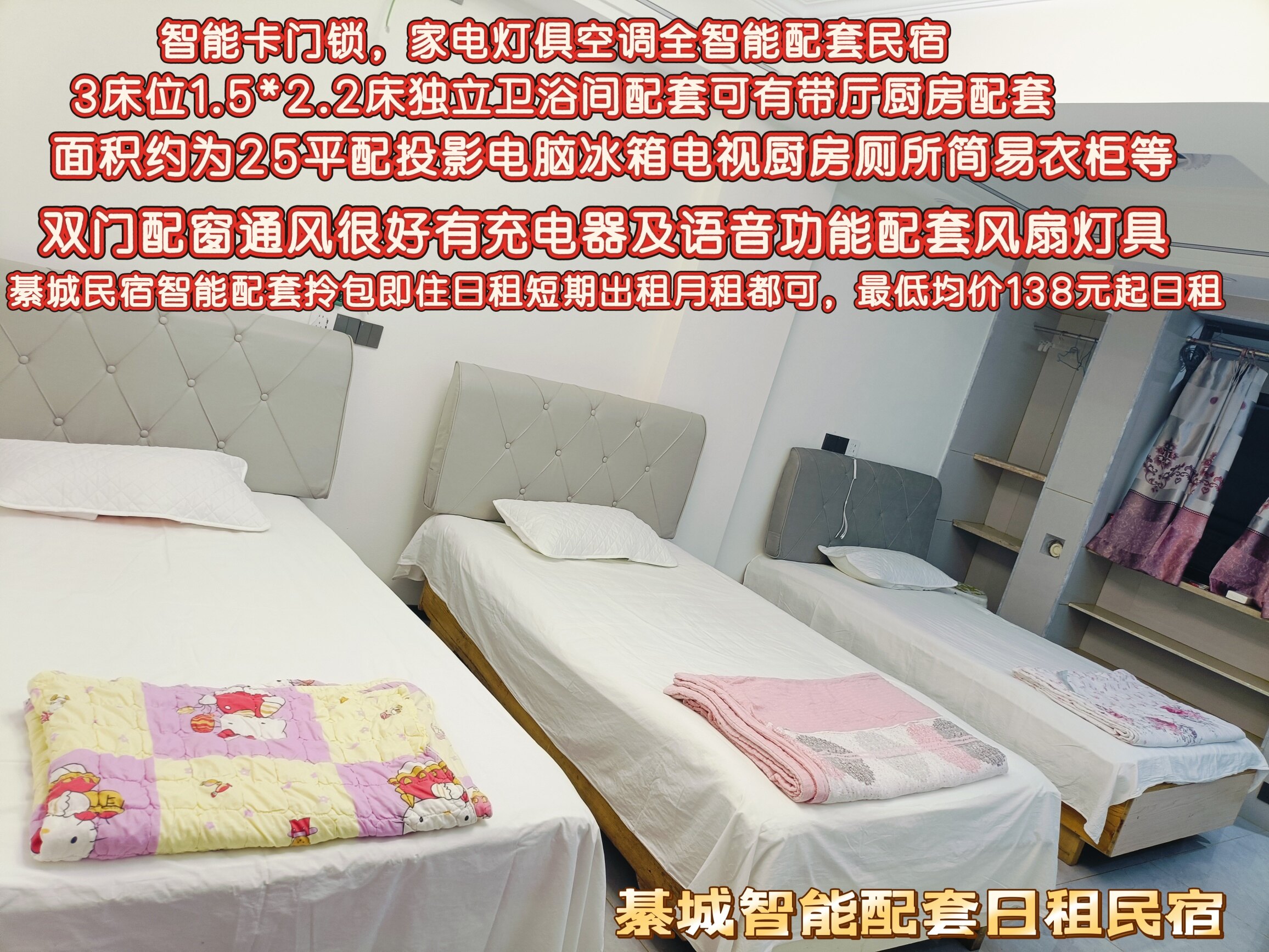 有三居室日租房民宿配置,价格388元起(位于水晶城、北街、半山国际、綦城雅座及开发区)。