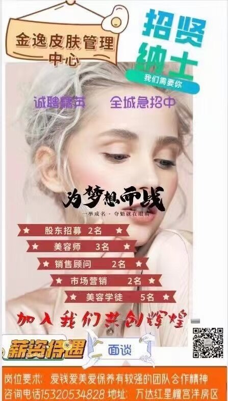 不要求你有多优秀,但必须有追求、有目标、做事认真有责任心!不会可以教,只要你肯学[机智]金逸皮肤管理中心 期待你的加入!要求男女不限.欢迎广大朋友奔走相告[抱拳][抱拳]推荐人才者,重重有赏 联系热线: 15320534828