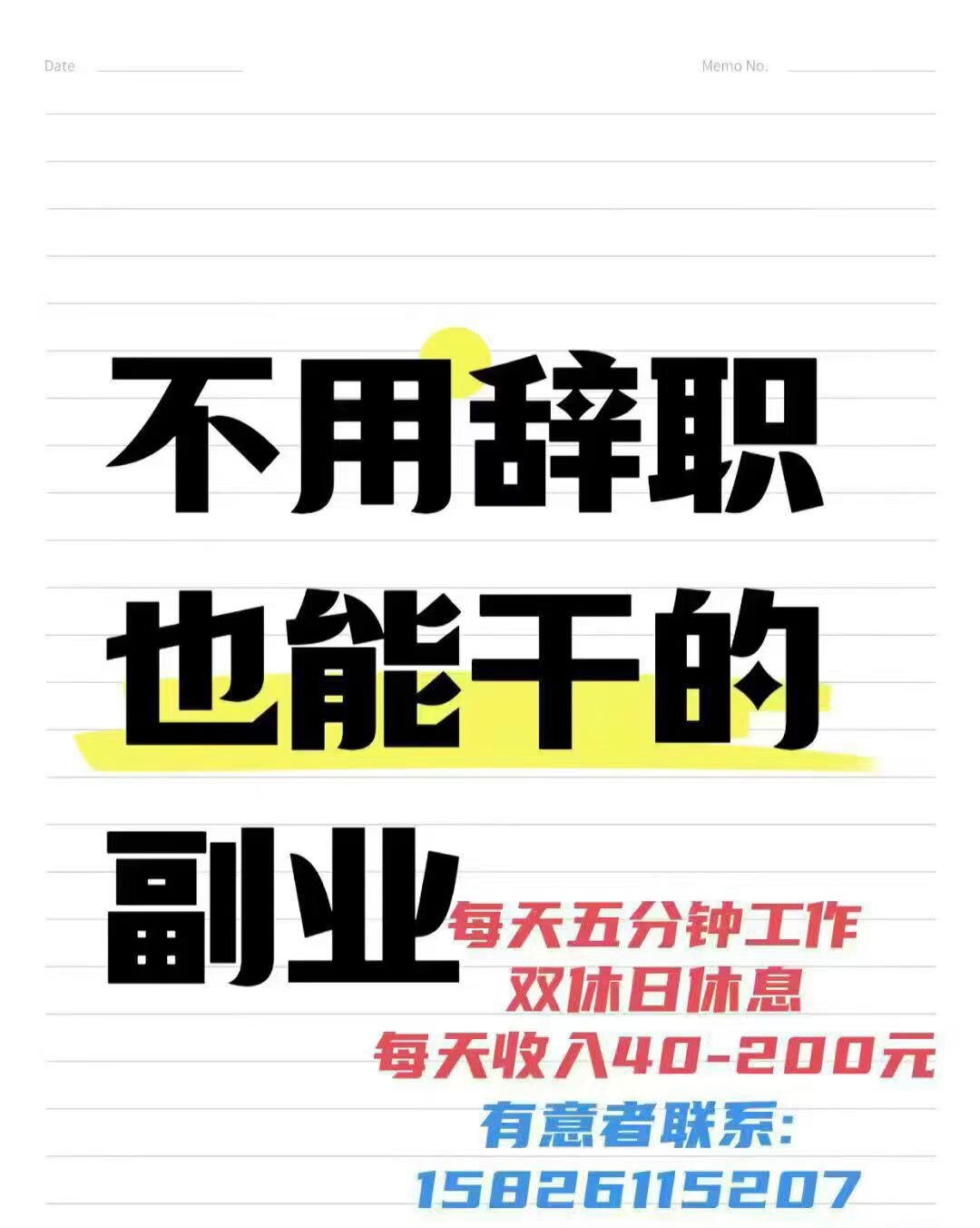 我不让你辞职!每天只工作五分钟,每天现金流收入40-100元,双休日。