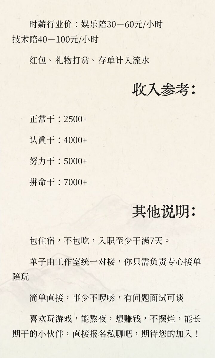 无底薪,打手流水与工作室分成(10000以下五五,10000及以上七三),次月15号结算